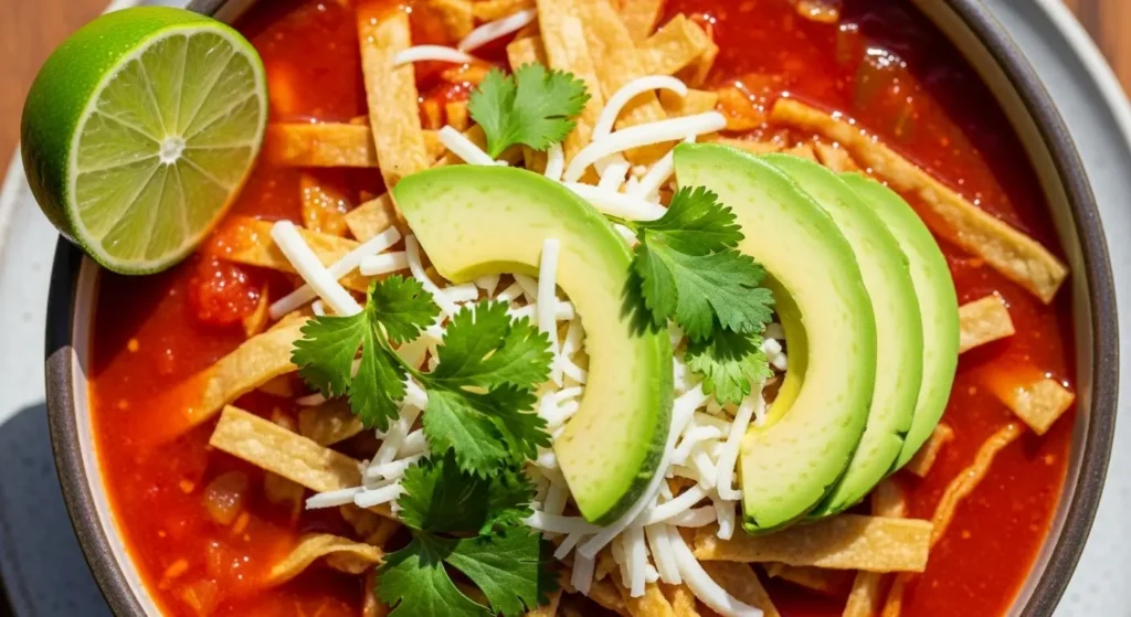 - Toppings: tortilla strips, avocado, shredded cheese, sour cream, cilantro, lime wedges