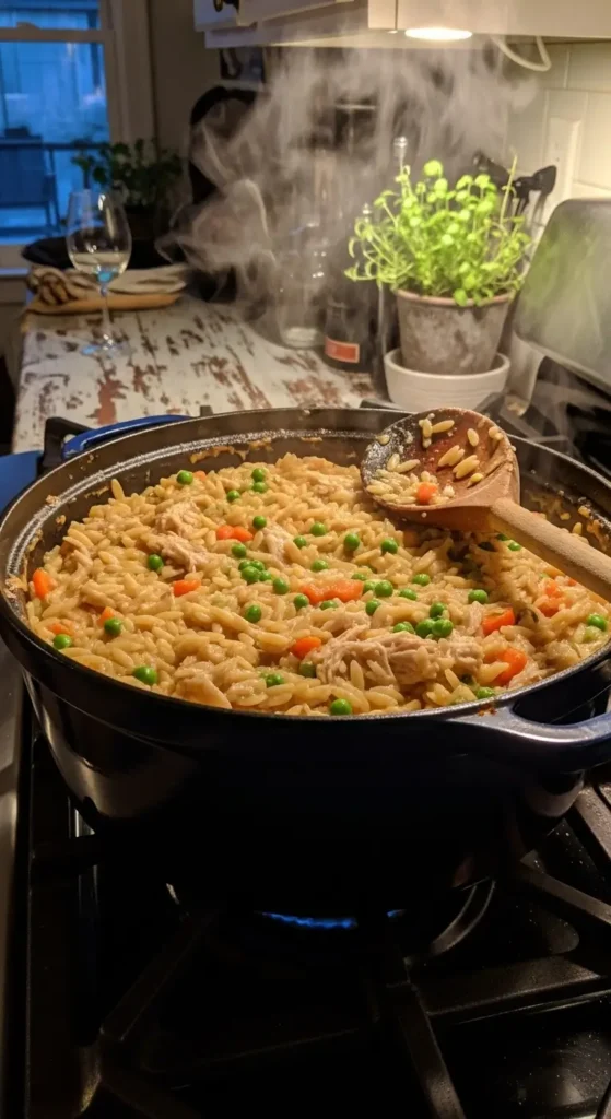 So basically, this is what happens when chicken pot pie meets pasta and they decide to make things way easier for busy people. Instead of dealing with pie crust (which, let’s be real, can be a total pain), you get all those cozy comfort food chicken orzo vibes in one single pot.