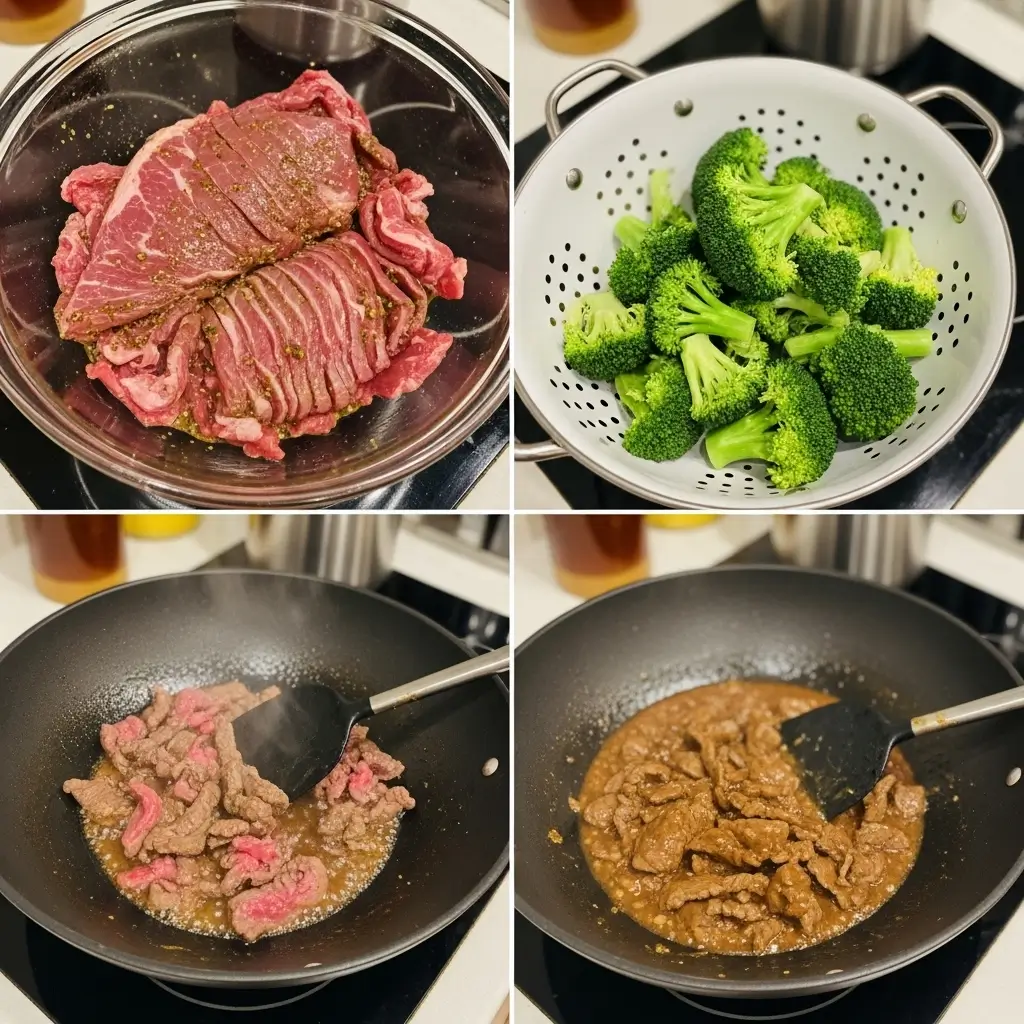 Mix the beef with the marinade ingredients (soy sauce, cornstarch, oil, and baking soda). Use your hands—it’s messy but therapeutic. Let it sit for at least 20 minutes. I usually do this first thing and then prep everything else.