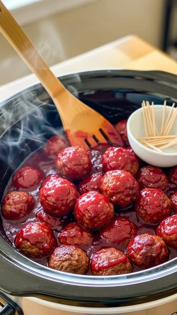 These brown sugar cranberry meatballs are the ultimate no-stress party food. You can make them in advance, they stay hot in the slow cooker, and people can just grab them with a toothpick without needing plates or forks.