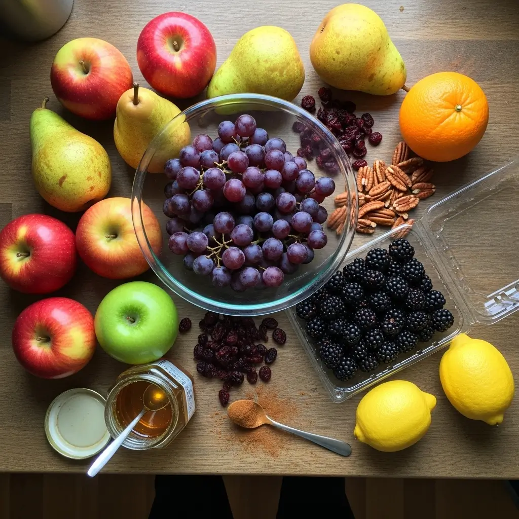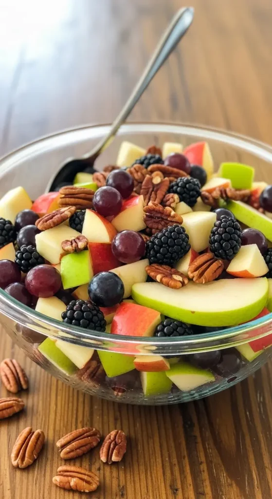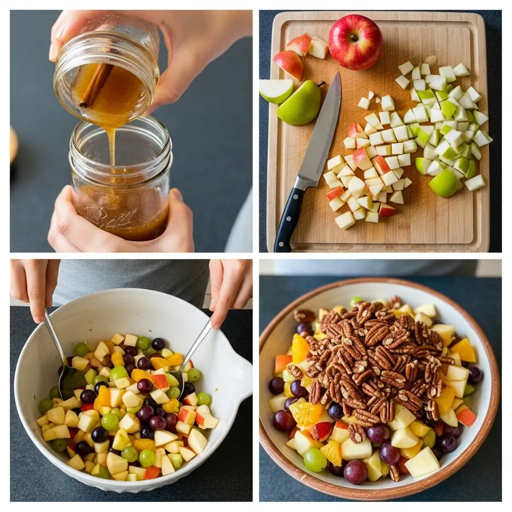 We’re talking apples, pears, grapes, and cranberries instead of strawberries and watermelon. And the dressing? It’s got cinnamon, orange juice, and maple syrup—basically liquid autumn in a bowl.