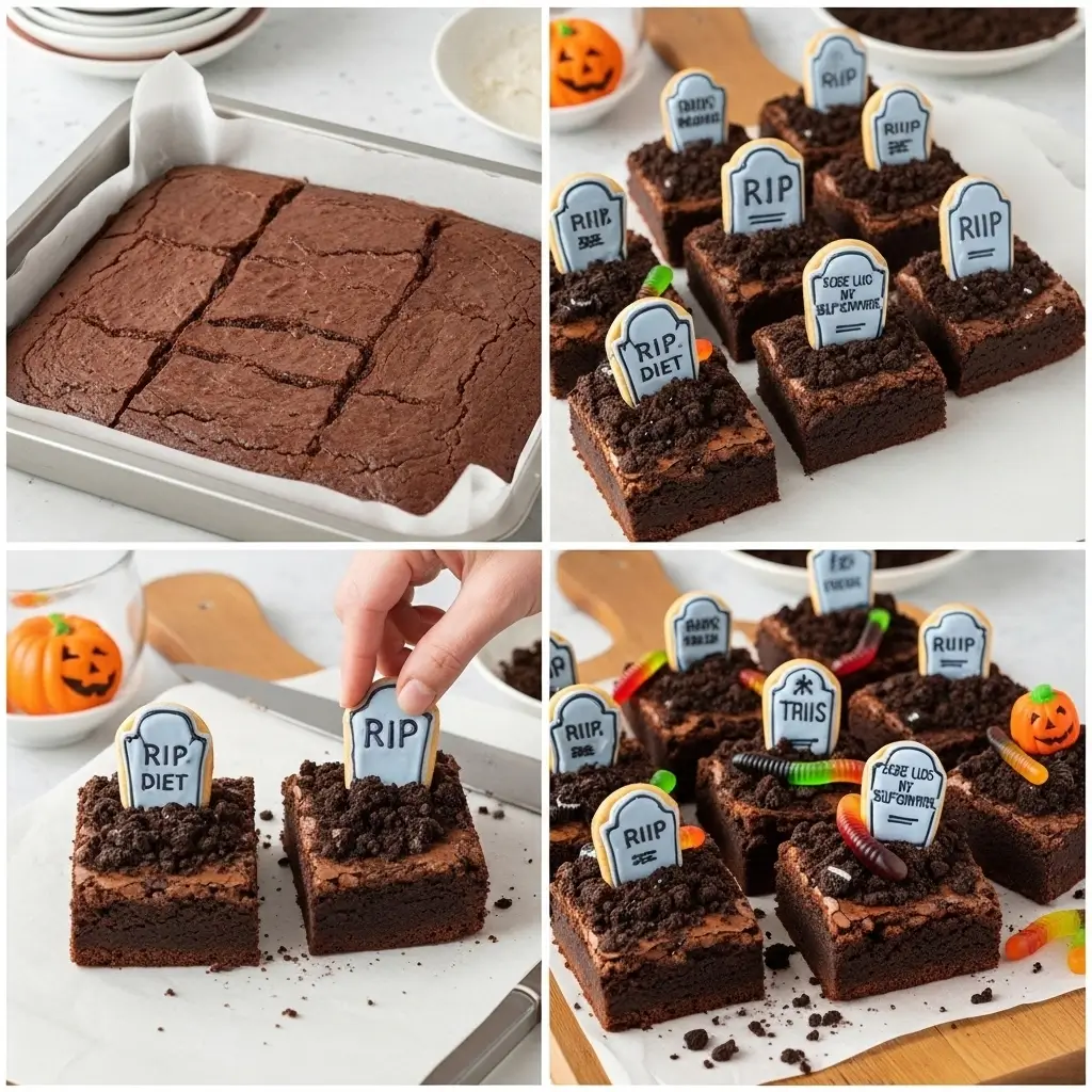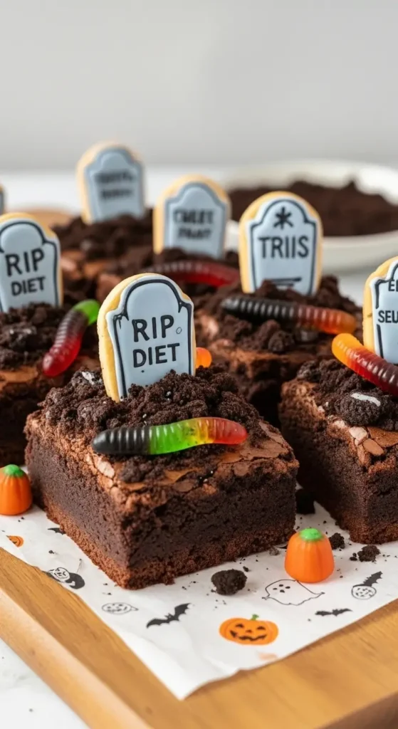 Sprinkle the crushed Oreos around the base of each tombstone. This is your graveyard dirt brownies moment. It actually looks like little mounds of dirt, which is either really cool or really disturbing depending on your mood.