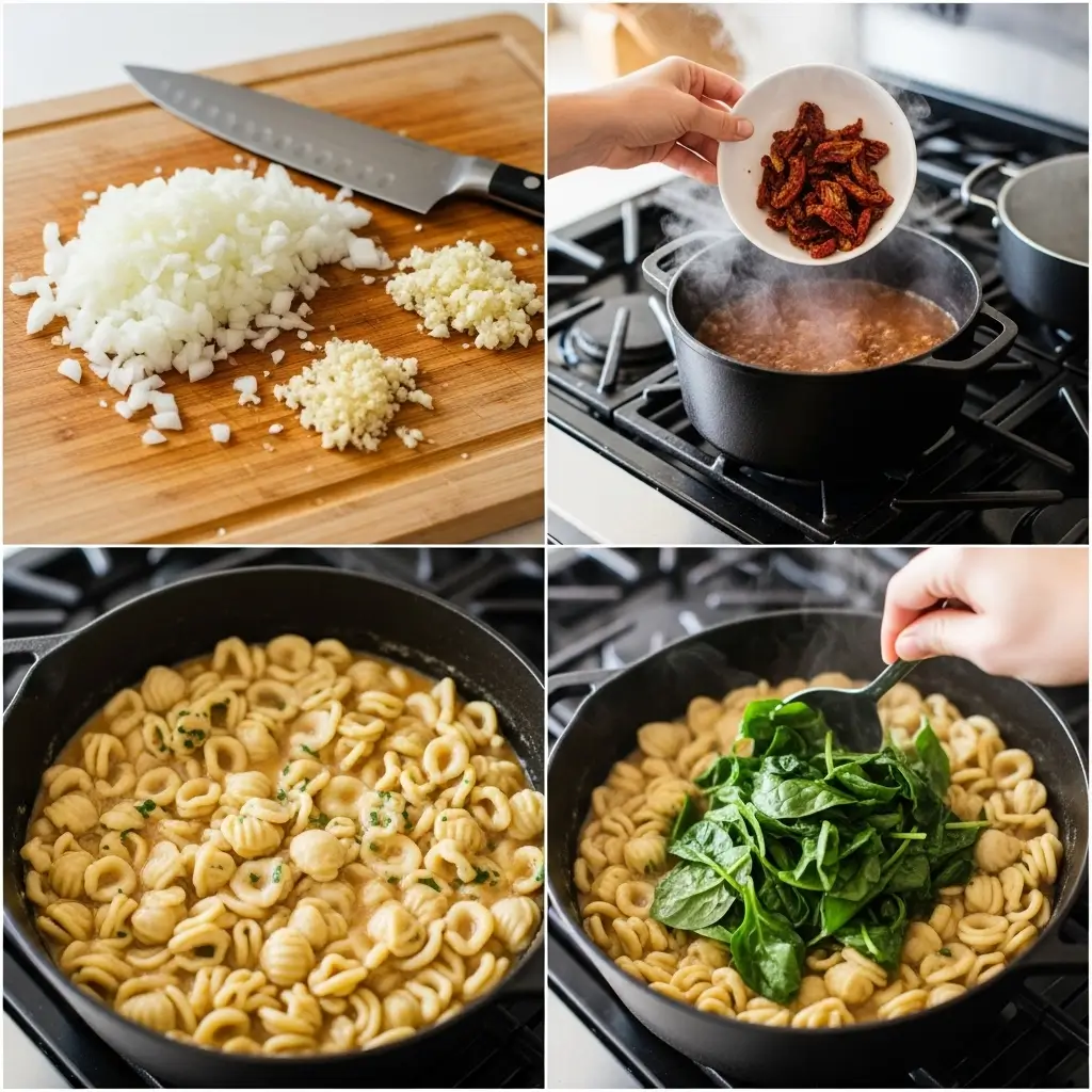 Heat your olive oil (or the oil from your sun-dried tomato jar—game changer!) in a large pot or Dutch oven over medium heat. Add the diced onion and cook for about 5 minutes until it’s soft and starting to smell amazing.