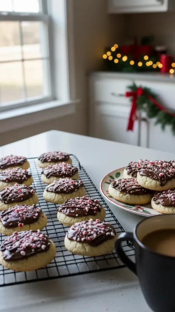 Drizzle the melted dark chocolate over the cooled cookies, then immediately sprinkle with the remaining crushed candy canes. The chocolate will harden as it cools and trap those candy cane pieces in place.
