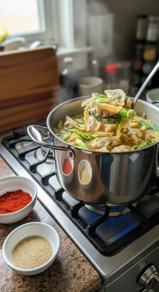 Taste the broth at this point. Does it need more soy sauce? More vinegar? This is your chance to adjust before adding the dumplings. I usually add an extra splash of soy sauce because I like things salty, but that’s just me.
