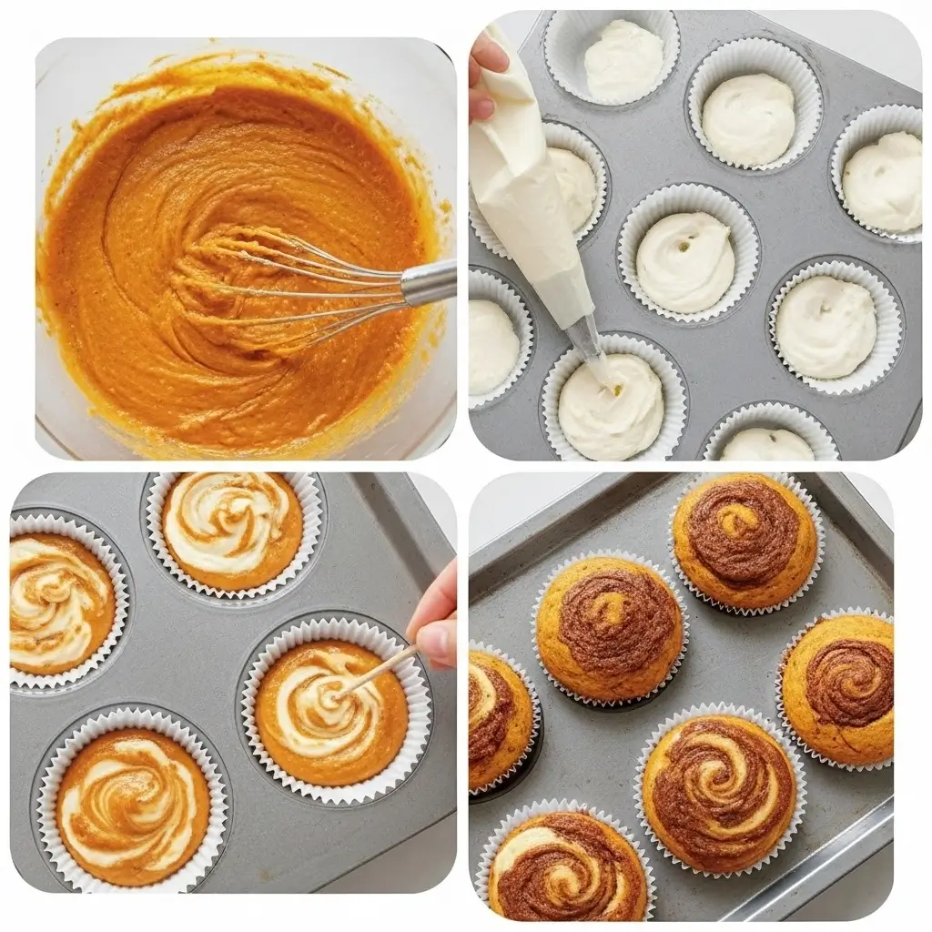 Step 6: The Swirl Magic Fill each muffin cup about 2/3 full with pumpkin batter. Then pipe or spoon about a tablespoon of the cream cheese mixture on top of each one.