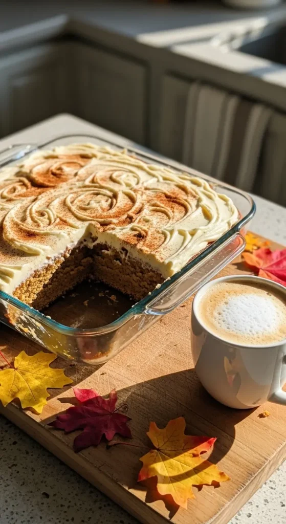 The espresso soak. Trust me on this one. I know it sounds extra, but it’s literally what makes this a “latte cake” instead of just another pumpkin cake. You poke holes in the warm cake and pour this sweet, milky espresso mixture over it. Sounds weird, tastes incredible.