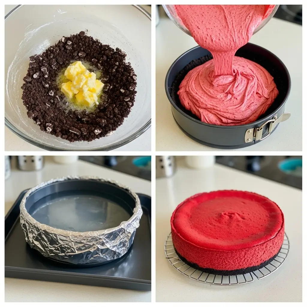 Pour the red velvet filling over the cooled Oreo crust. Smooth the top with a spatula. Place the springform pan in a larger roasting pan, then put both pans in the oven. Carefully pour hot water into the roasting pan until it comes about halfway up the sides of the springform pan.