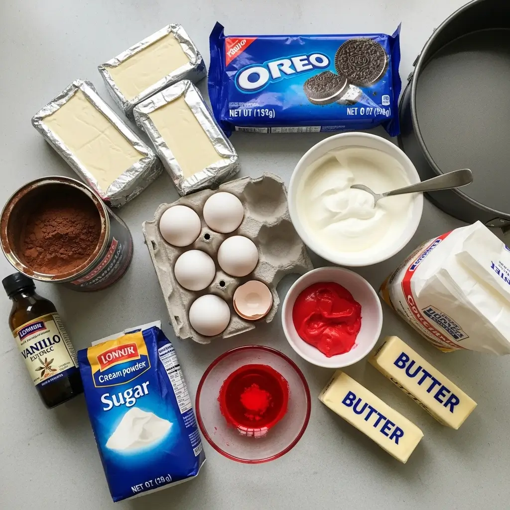 Let me break down what you actually need for this decadent red velvet oreo cheesecake dessert: