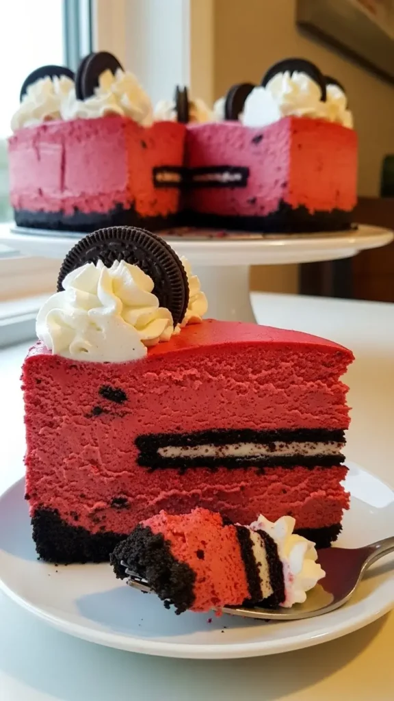 The combination sounds over-the-top, and it kind of is, but that’s the whole point. The rich, tangy cream cheese filling gets that signature red velvet flavor from cocoa powder and red food coloring, while the crushed Oreo crust adds this chocolatey crunch that’s just… chef’s kiss. And the color? It’s like baking a show-stopping statement piece that happens to taste incredible.