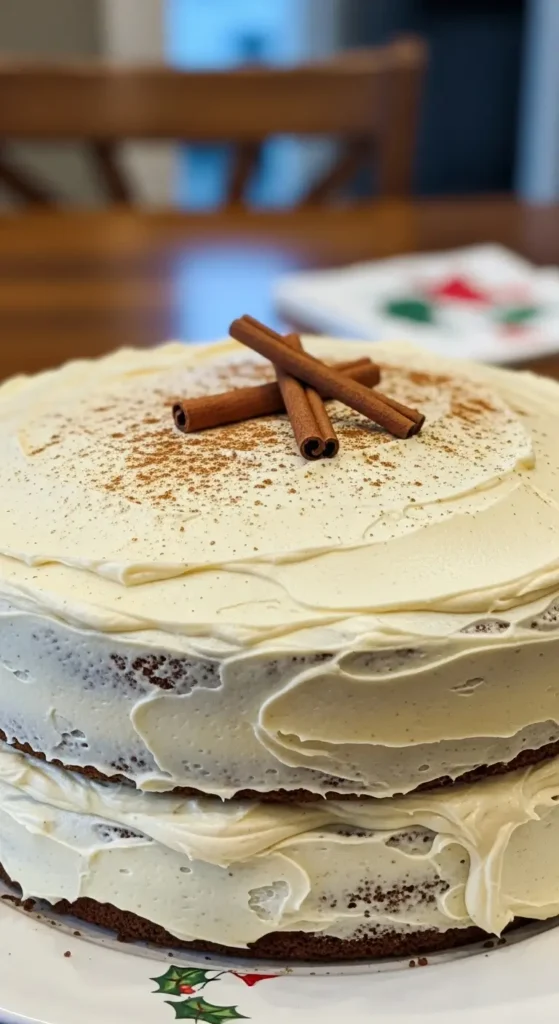 But here’s the thing—even if your layers are a little uneven or your frosting isn’t Instagram-perfect, this cake tastes AMAZING. The spices are warm and cozy without being overwhelming. The eggnog buttercream is creamy and just boozy enough from the rum extract to taste grown-up.