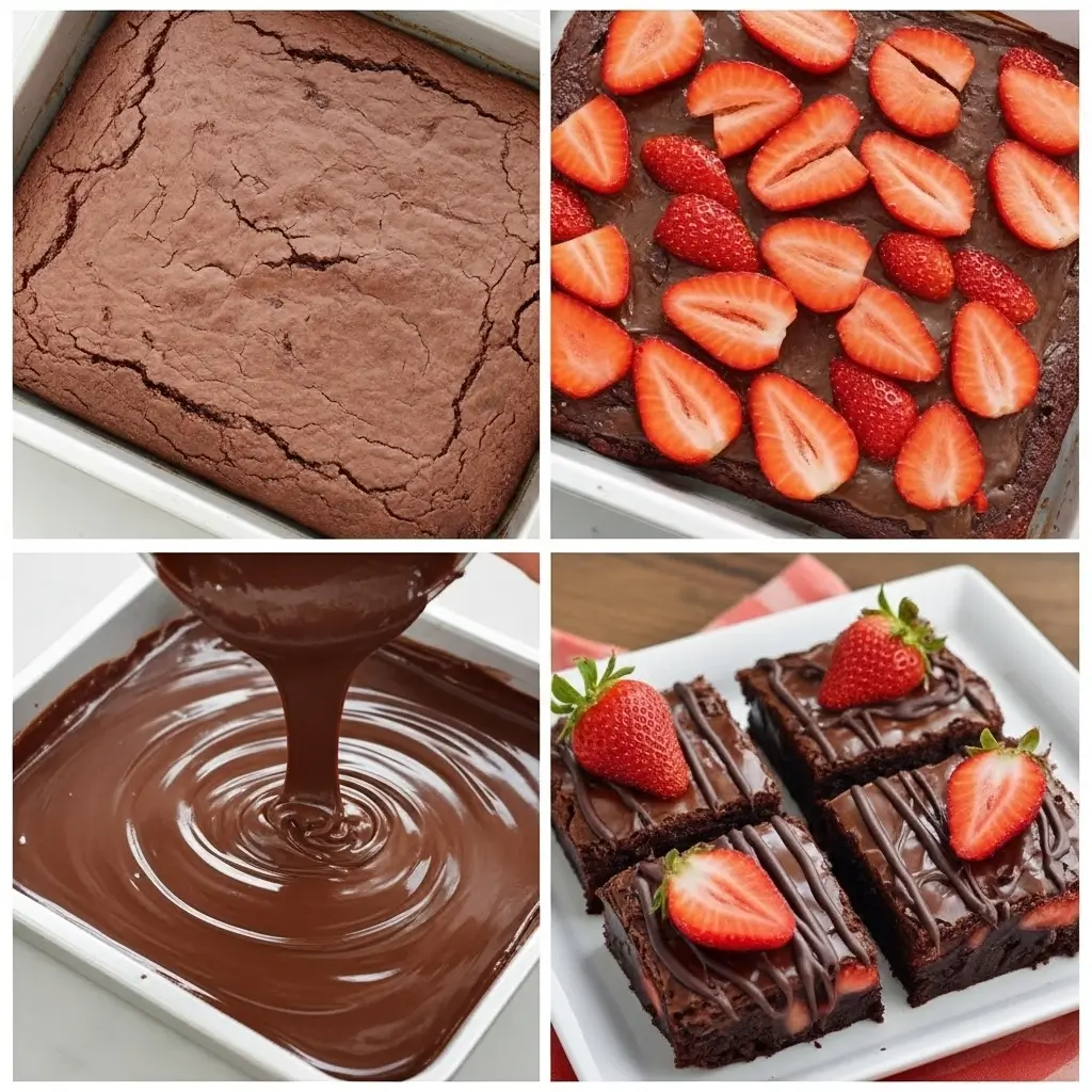 Step 6: The Chocolate Drizzle (Or Pour, Whatever) Pour the melted chocolate over your strawberry layer. Use a spatula to spread it around. It won’t be perfectly smooth and that’s fine—we’re going for “homemade romantic strawberry brownie dessert” not “professional bakery.”